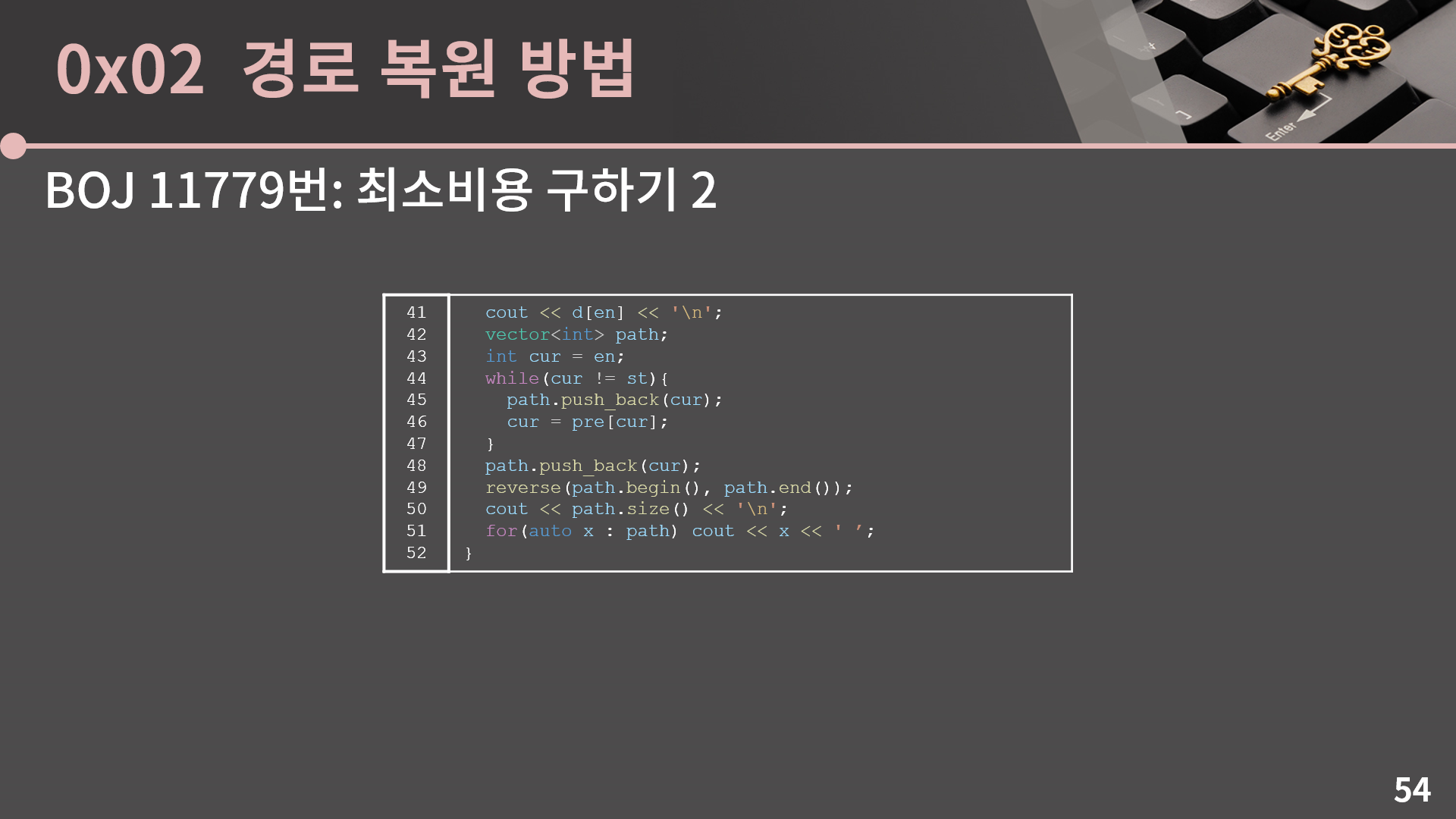이렇게 과정이 끝났고, pre 테이블을 다 채운 후 이 정보를 바탕으로 경로를 복원하는건 그냥 pre를 타고 시작점을 만날 수 계속 이동하는 방식으로 처리가 가능합니다. 이건 바로 앞에서 배운 플로이드 알고리즘 단원에서 언급이 있어서 바로 코드를 살펴보겠습니다. BOJ 11779번: 최소비용 구하기 2 이 문제를 가지고 확인을 해볼 수 있습니다. 앞의 다익스트라 코드에서 조금만 바꾸면 되니까 직접 시도해보도록 합시다.