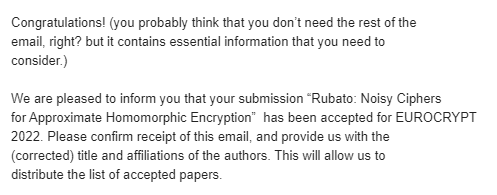 랩 형들이 하던 연구에 꼽사리껴서 처음으로 써본 논문이 Eurocrypt 2022 컨퍼런스에 통과되었습니다. 랩에서는 논문을 다작하기 보다는 탑컨퍼런스 위주로 내다보니 논문을 처음 작성해보게 된 시기가 그렇게 빠르지 않았는데 처음으로 쓴 논문이 이렇게 좋은 결과가 나와서 감개가 무량하네요,,,