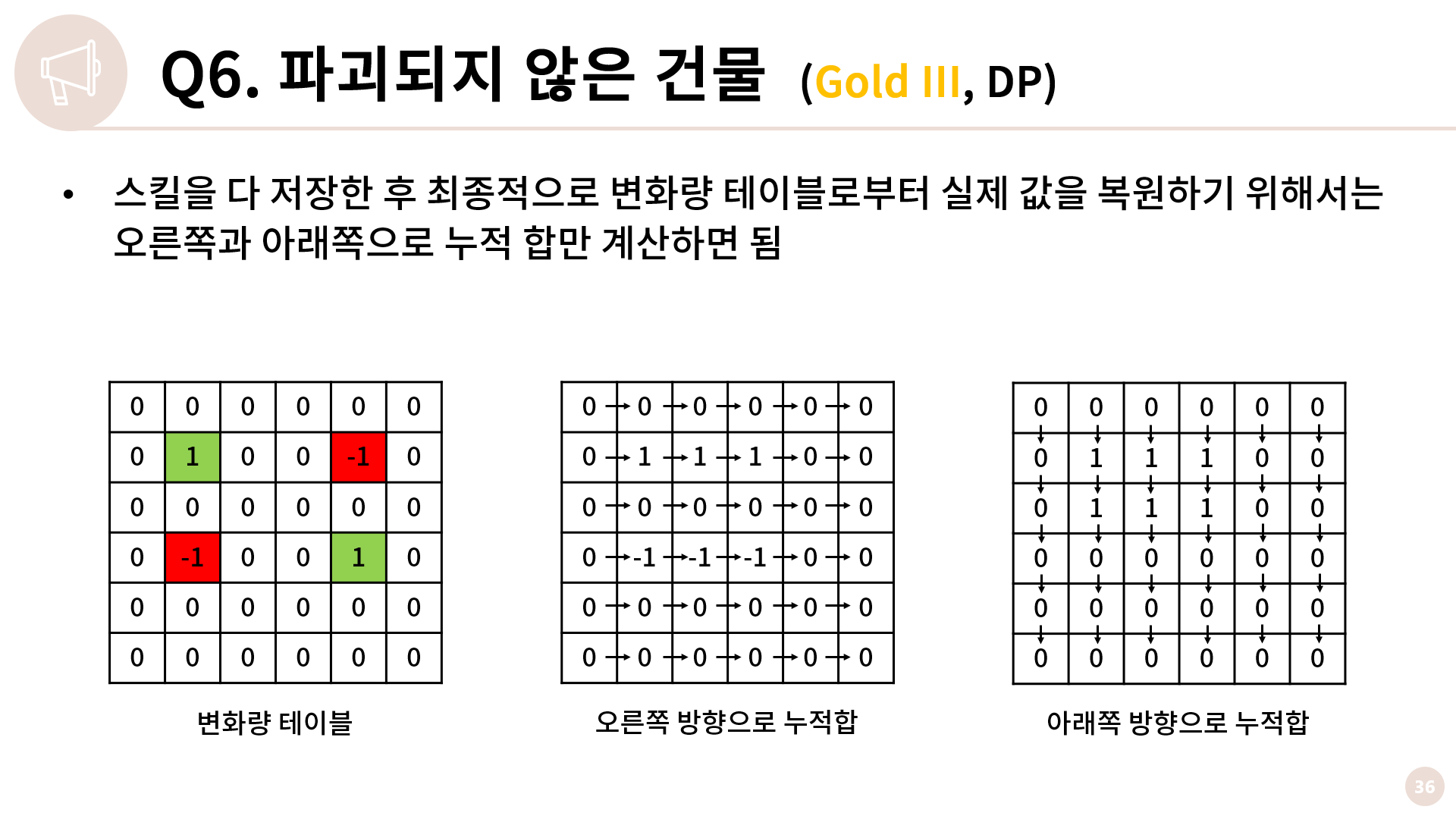 그리고 변화량 테이블의 각 값은 자신의 오른쪽과 아래에 있는 모든 칸에 전파가 되어야 하니 오른쪽 방향으로 누적합을 한 번 돌리고 다음으로 아래쪽 방향으로 누적합을 한 번 돌리면 깔끔하게 해결됩니다.