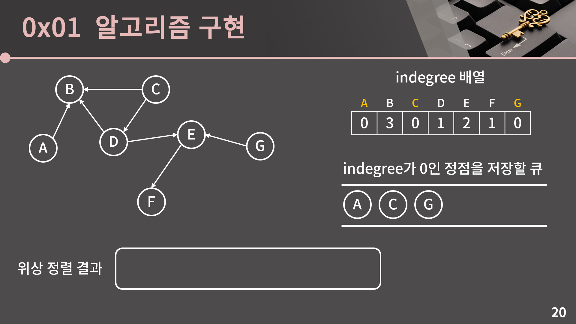 현재의 이 그래프에서 indegree가 0인 정점이 무엇인가 살펴보면 A, G, C가 가능한 후보군임을 알 수 있습니다.