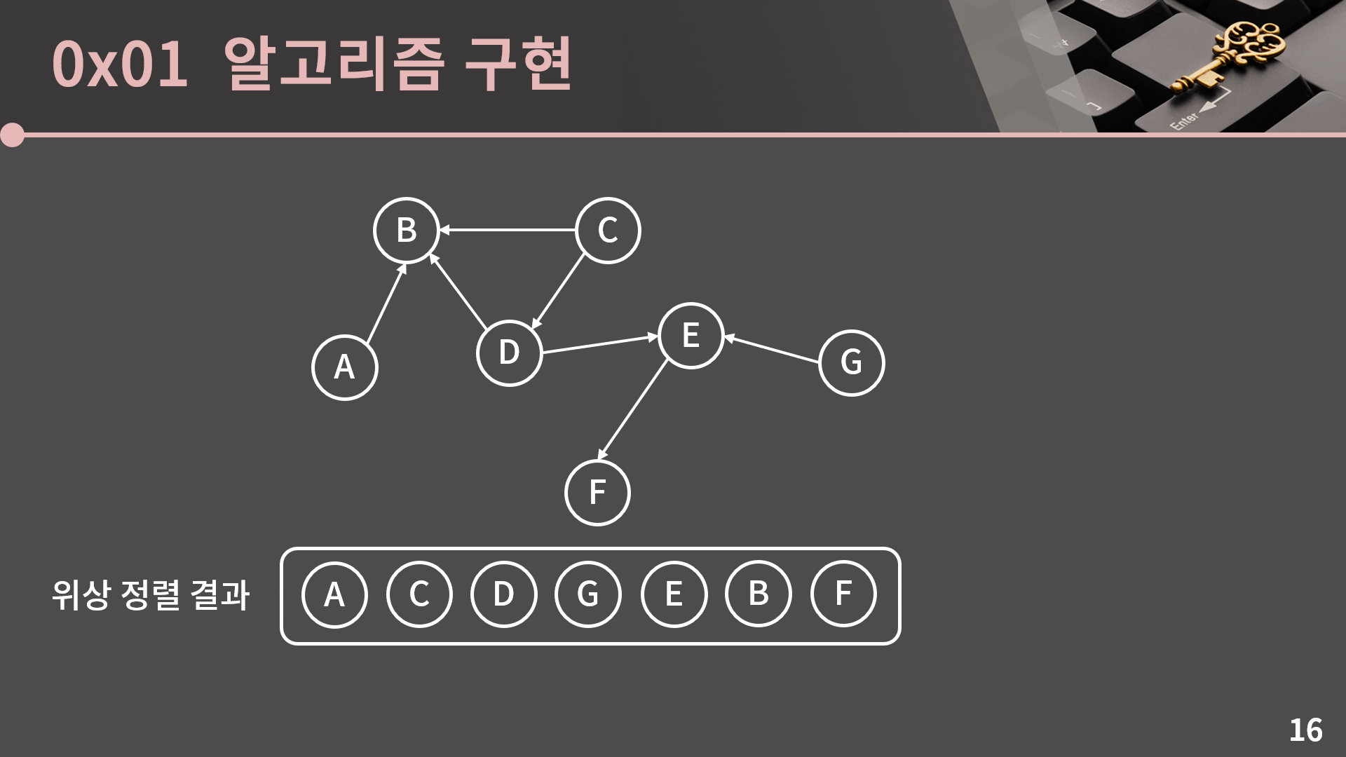 이제 저희는 사이클이 존재하지 않는 방향 그래프에서 해당 알고리즘이 늘 올바른 위상 정렬 결과를 내어준다고 믿고 계속 진행하겠습니다.