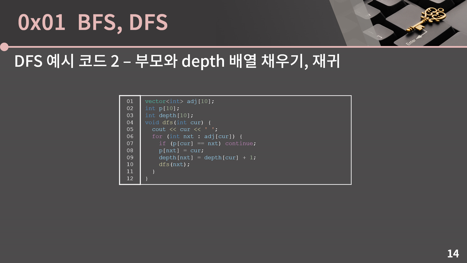 DFS도 BFS와 비슷하게 자신과 연결된 정점들은 1개만 부모이고 나머지는 전부 자식이라는 성질을 이용해 vis 배열을 쓰는 대신 부모 배열과 depth 배열을 채우면서 처리가 가능합니다. 코드를 참고해보세요.