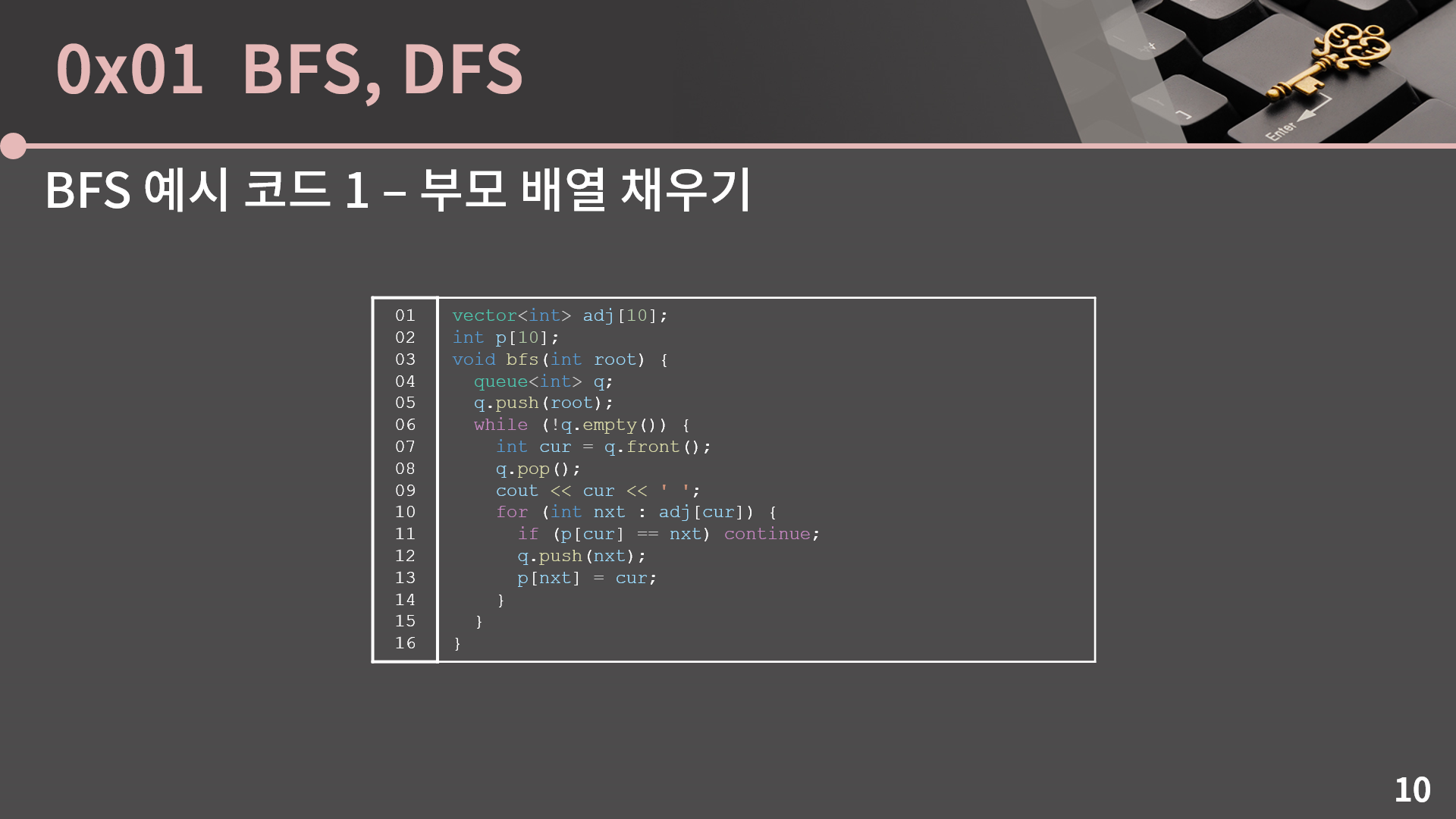 즉 트리에서는 BFS의 과정 속에서 자신의 자식들을 전부 큐에 넣어주기만 하면 됩니다. 이 말은 곧 자신과 이웃한 정점들에 대해 부모만 빼고 나머지는 전부 큐에 넣으면 됨을 의미하고, 그렇기 때문에 vis 배열을 들고갈 필요가 없이 그냥 부모가 누구인지만 저장하고 있으면 됩니다. 부모의 정보는 BFS를 돌리면서 자식 정점을 큐에 집어넣을 때 채워줄 수 있습니다. 다음 슬라이드의 코드를 보면서 이해해봅시다.