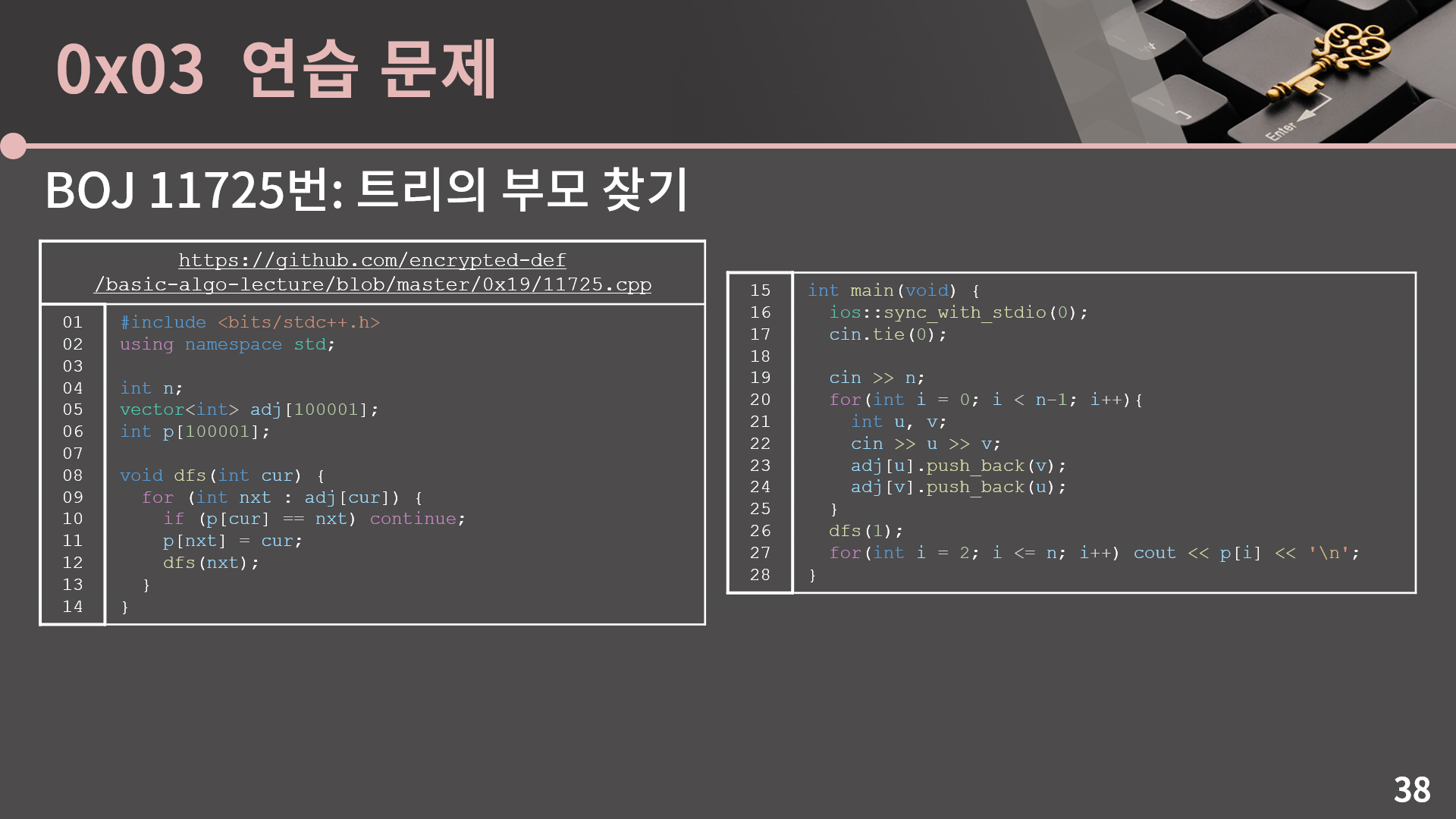 드디어 연습 문제를 풀어볼 시간입니다. BOJ 11725번: 트리의 부모 찾기 문제를 같이 풀어봅시다. 이번 강의에서 다룬 내용을 잘 이해했다면 이 문제는 아주 쉽게 구현할 수 있어야 합니다. 코드를 바로 보겠습니다.