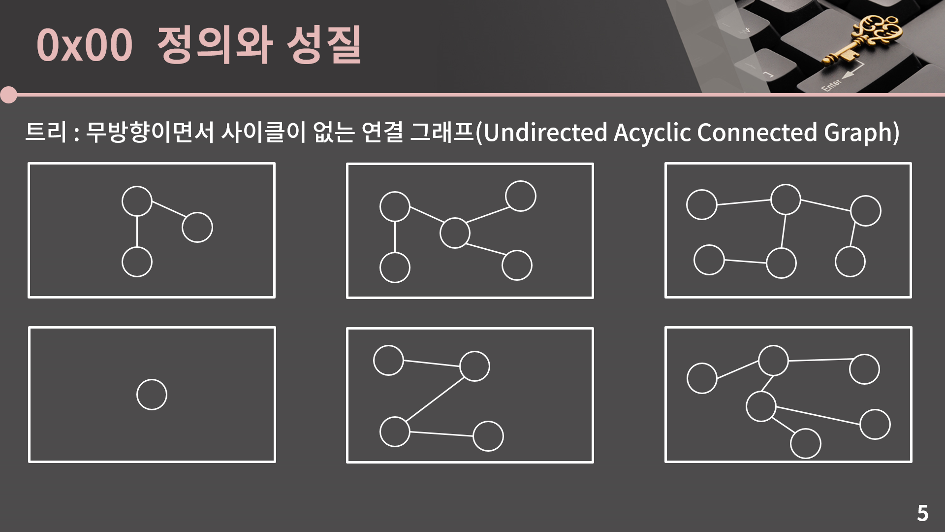 트리의 수학적인 정의로부터 이 슬라이드에서 제시된 다양한 그래프들이 전부 트리임을 알 수 있습니다. 앞에서 이진 탐색 트리를 다룰 땐 계층적인 구조의 관점에서 트리를 다루었지만 트리의 정의 상으로는 계층과 관계된 것이 없으며, 또 정점이 1개이고 간선이 없는 그래프도 트리임에 유의해야 합니다.