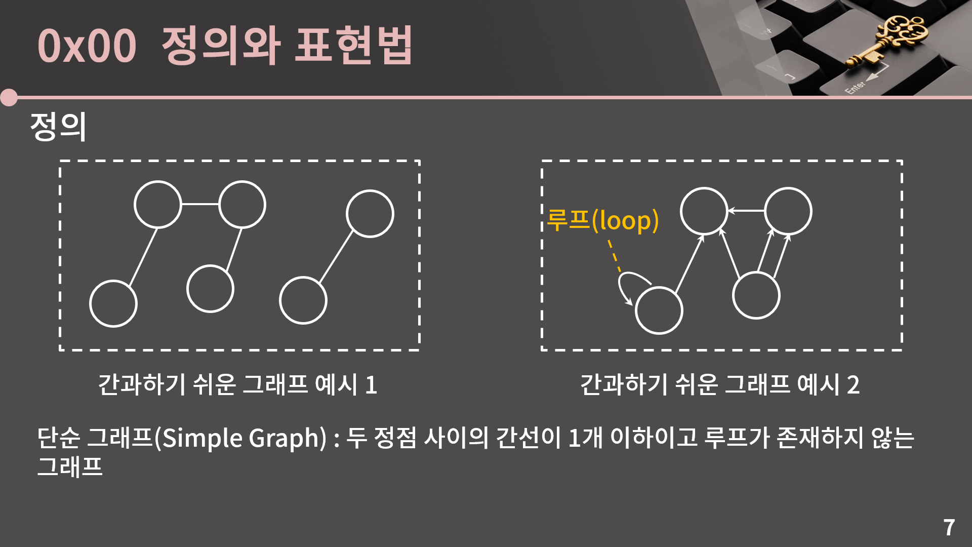 그래프는 꼭 연결되어 있을 필요도 없고, 또 두 정점 사이의 간선이 반드시 1개 이하일 필요도, 또 간선이 반드시 서로 다른 두 정점을 연결해야 할 필요도 없습니다. 좀 이질적이긴 하지만 아무튼 한 정점에서 시작해 같은 정점으로 들어오는 간선이 있을 수도 있습니다. 이런 간선을 우리는 루프(loop)라고 부릅니다.