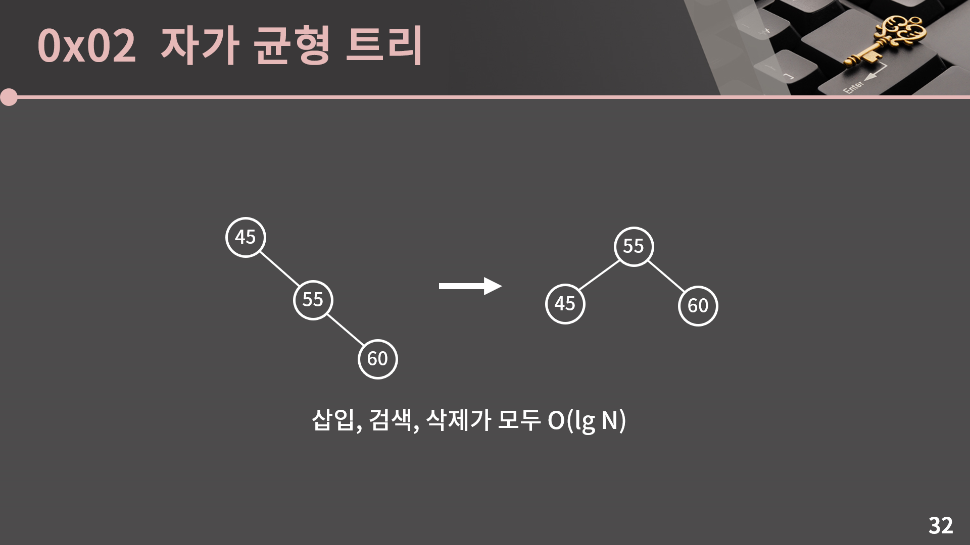 진짜 간단하게 원리를 설명드리면 지금 이 그림처럼 뭔가 불균형이 발생했을 때 트리를 꺾어버립니다. 이러면 불균형을 없앨 수 있습니다. 아주 간단하게 설명하면 이런거고, 둘 중 어느 하나라도 어떻게 동작하는지를 알고 나면 드디어 실제로 써먹을 수 있는 이진 검색 트리를 구현할 수 있어서 설명을 드리고 싶긴 한데 문제는 방법이 너무 복잡합니다. 삽입/삭제가 일어날 때 마다 불균형을 확인해야 하는데 각 정점의 자식이 0개/1개/2개일 때 이런 식으로 케이스를 나눠서 각각 방식을 설명해야 하고 뭐 여러가지로 쉽지가 않습니다. 그래서 자가 균형 트리가 무엇이고, 왜 필요한지, 그리고 아주 대략적으로나마 구현이 어떤 식으로 이루어지는지만 안걸로 만족하고 자세한건 설명을 생략하겠습니다. 이렇게 편향성을 해소해주는 자가 균형 트리를 사용할 때 비로소 이진 검색 트리에서 삽입, 검색, 삭제가 모두 O(lg N)이 됩니다.