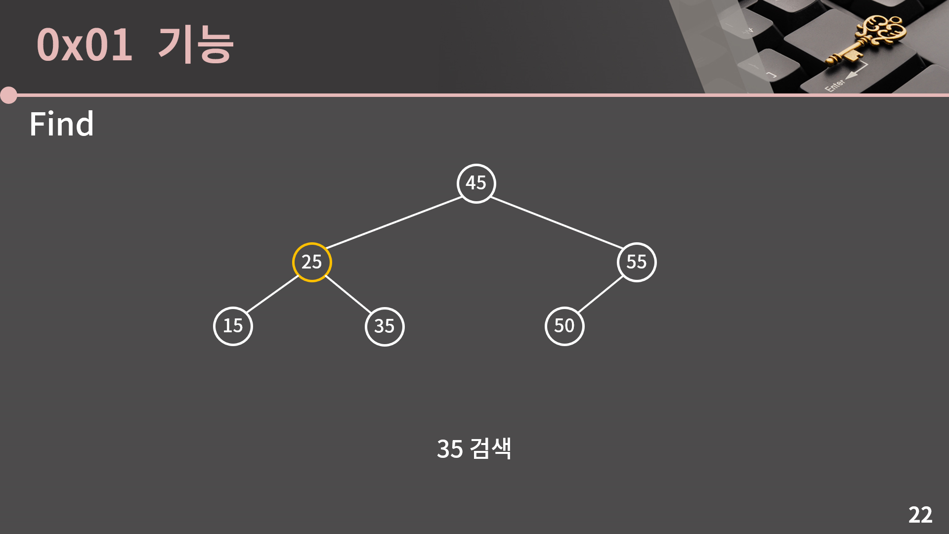 그 다음에는 오른쪽으로 가야 합니다. 지금 보고 있는 값이 딱 35가 되었기 때문에 찾는 과정이 끝납니다.