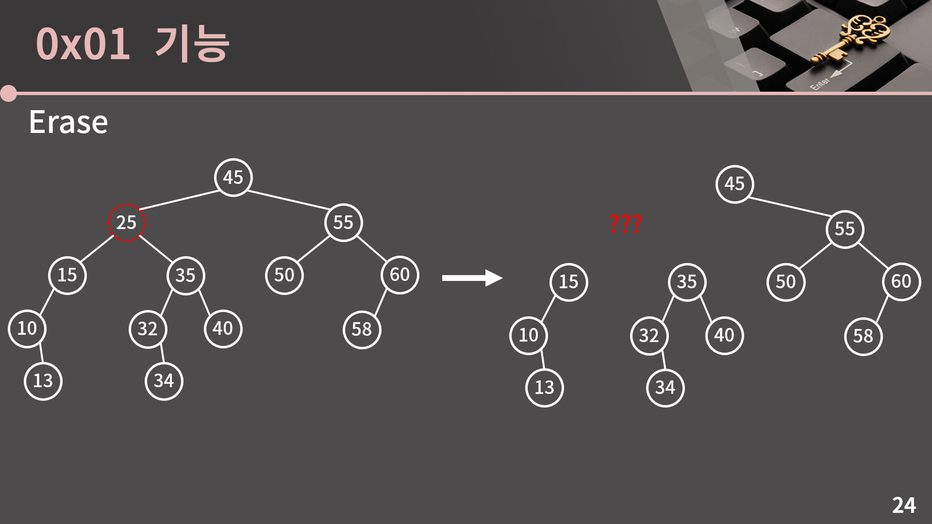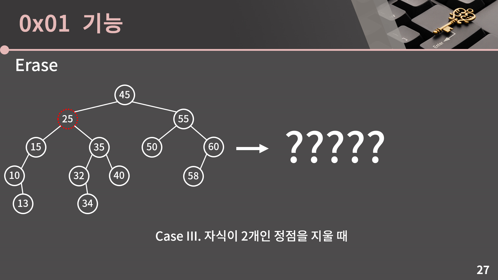그런데 지금 32를 지우고 25로 옮기는게 별 문제 없었던 이유가 32의 자식이 1개여서였습니다. 만약 32의 자식이 2개였으면 32를 지우는게 또 복잡해질텐데 이런 경우에는 어떻게 해야할까요? 한 번 고민을 해봅시다.