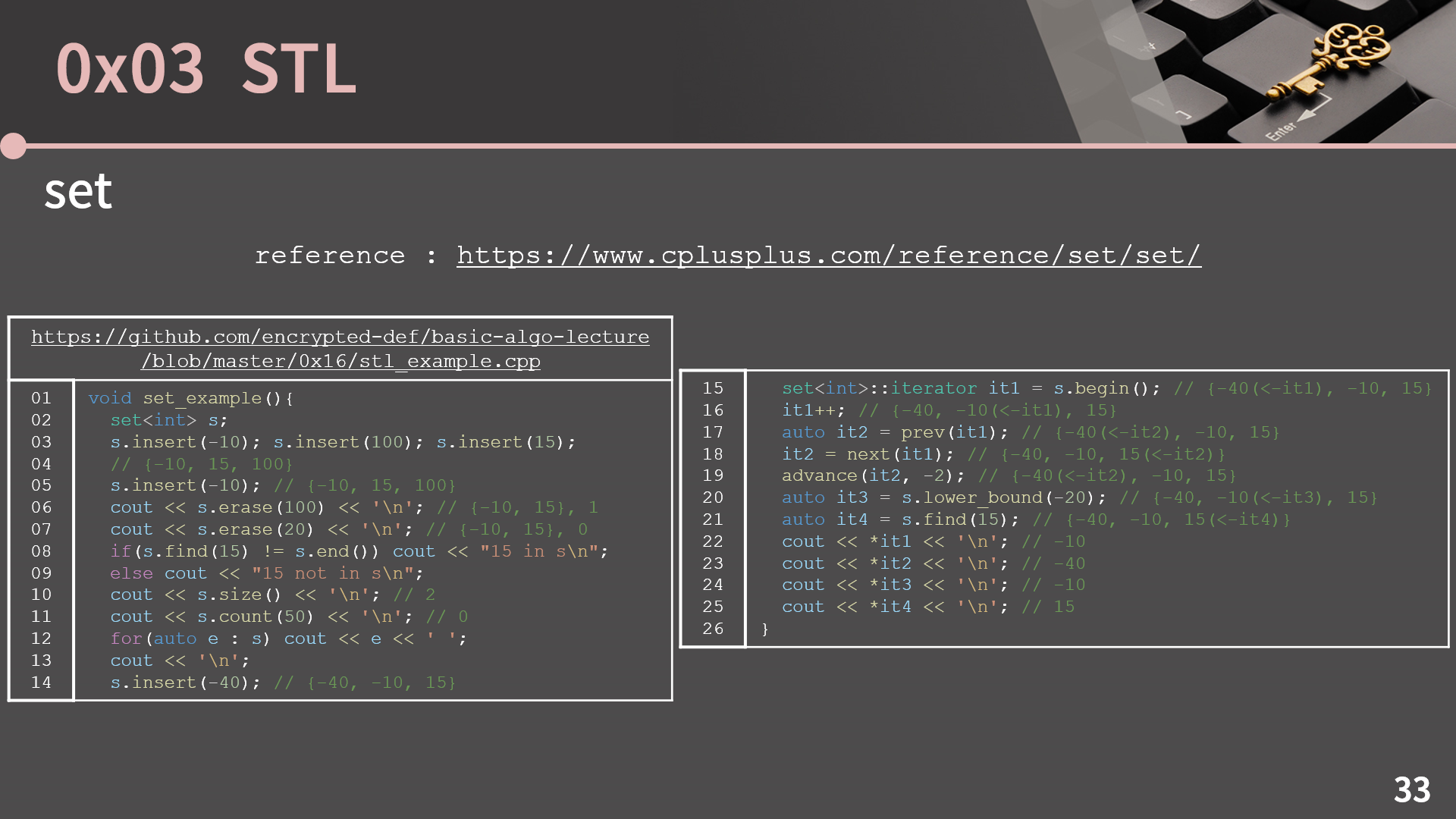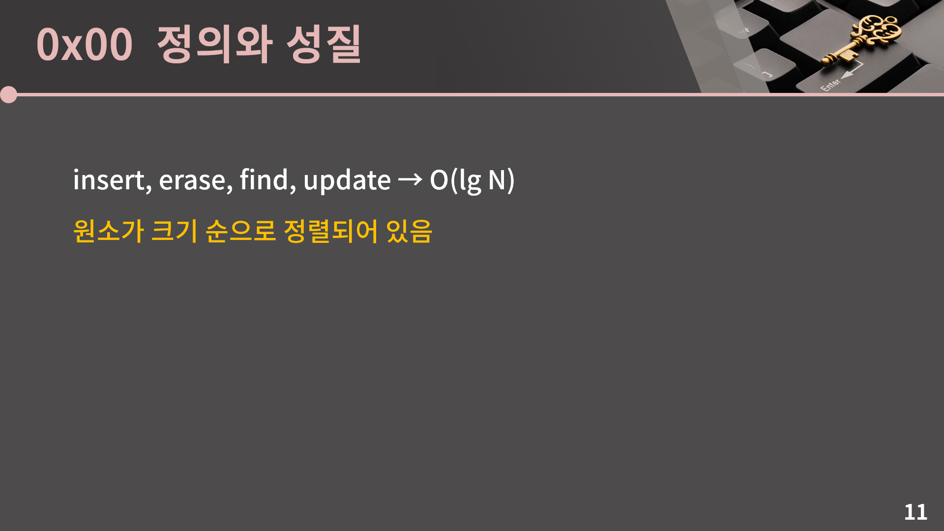 lower_bound는 이분탐색 단원에서 나왔던 그 lower_bound랑 기능이 동일한데, 특정 원소가 삽입되어도 오름차순 순서가 그대로 유지되는 가장 왼쪽 위치를 나타냅니다. lower_bound가 있다는 것에서 짐작할 수 있겠지만 순서가 그대로 유지되는 가장 오른쪽 위치를 나타내는 upper_bound랑, lower_bound와 upper_bound 쌍을 반환하는 equal_range도 그대로 있습니다. 이 멤버 함수들의 시간복잡도를 보면, set에서는 진짜 그냥 온갖 연산이 다 O(lg N)이라고 생각하면 됩니다. size, end, begin 함수는 그냥 멤버 변수로 가지고 있던 값을 바로 반환할테니 O(1)이지만 insert, erase, find, lower_bound, next, prev 등은 모두 O(lg N)입니다. 단 advance의 경우에는 한 칸을 움직이는게 O(lg N)이기 때문에 advance(it, 100); 이라고 하면 이게 그냥 O(lg N)이 아니고 한 칸 움직이는 O(lg N) 연산을 100번 수행하는 상황이란건 기억을 하고 계셔야 합니다.