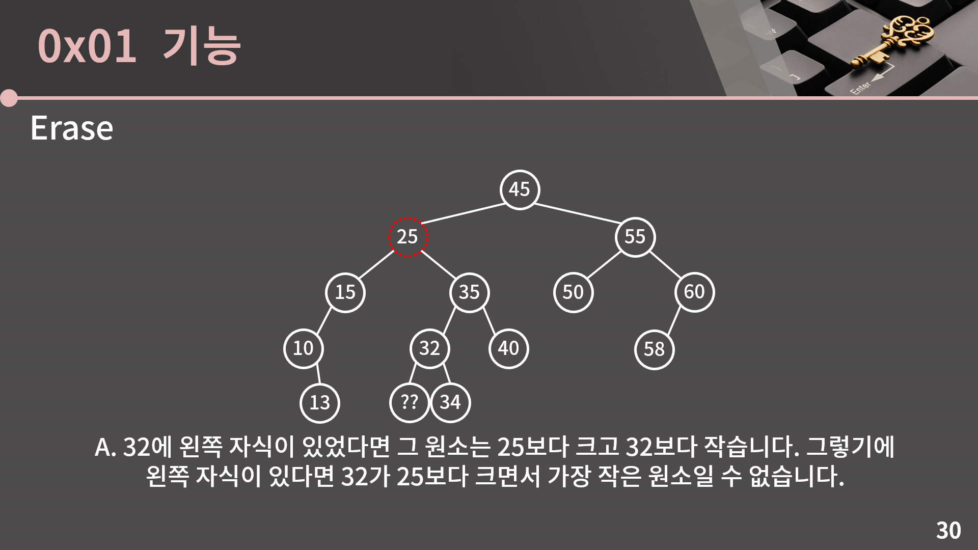 다행히 그런 일은 일어날 수가 없습니다. 만약 32에 왼쪽 자식이 있었다면 그 원소는 25보다 크고 32보다 작아야 합니다. 그렇기 때문에 왼쪽 자식이 있다면 32가 25보다 크면서 가장 작은 원소일 수 없습니다.