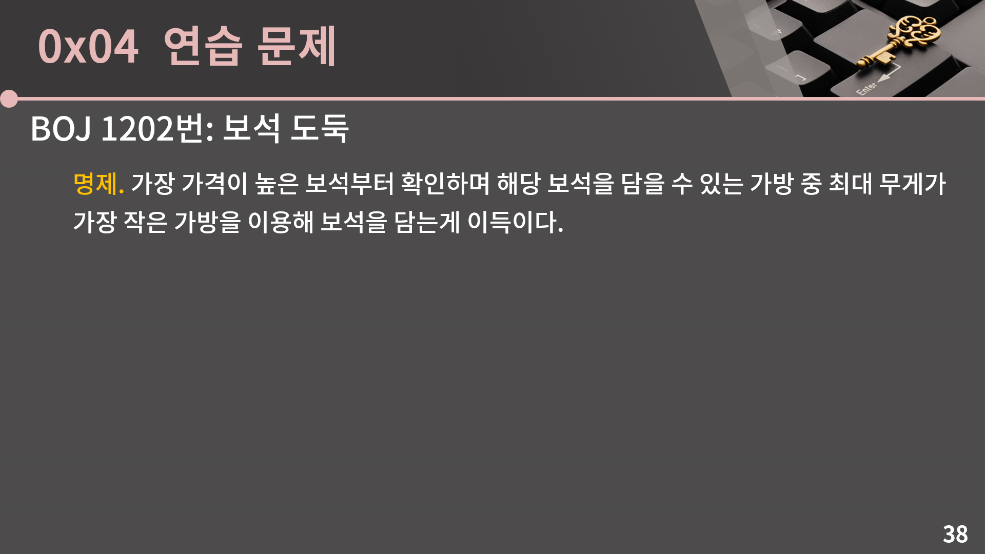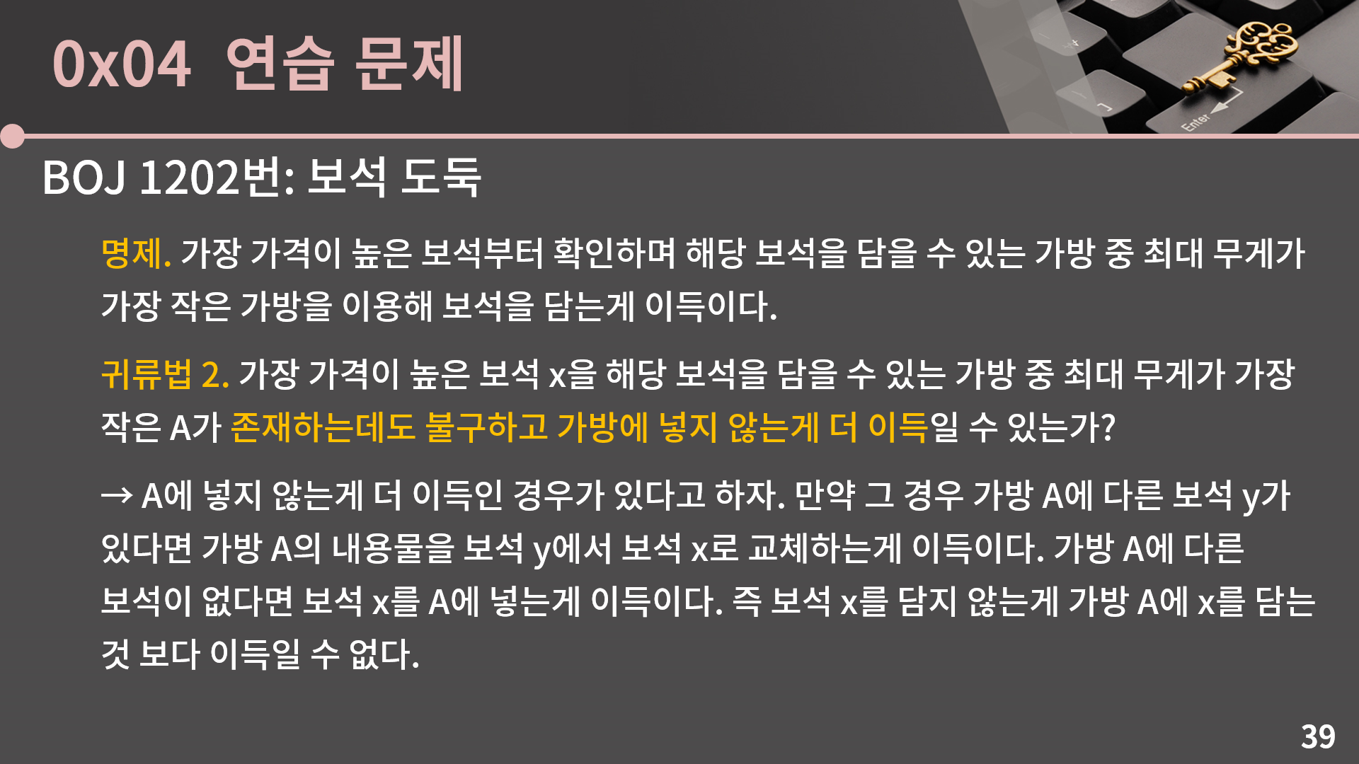 이건 어떻게 생각을 하면 되냐면, 또 마찬가지로 A에 안 넣는게 이득인 경우가 있다고 해보겠습니다. 그런 경우 가방 A에 다른 보석 y가 있다면 x가 가장 가격이 크다고 했으니 y 대신 x를 넣는게 더 이득입니다. 만약 가방 A에 다른 보석이 없다면 보석 x를 버리는 것 보다 A에 넣는게 더 이득입니다. 결론적으로 보석 x를 담지 않는게 가방 A에 x를 담는 것 보다 이득일 수 없습니다. 이렇게 정당성을 차근차근 따져본 결과 그리디 풀이가 맞다는걸 알 수 있었고 구현을 하면 되는데 구현을 딱 하려고 본 순간 뭔가 단순히 배열만 가지고는 해결이 안되는구나 하는걸 알 수 있습니다. 그냥 막 구현하면 O(NK)이고, 어떻게 시간복잡도를 좀 줄여보겠다고 보석을 가격 순으로 정렬하고 가방도 최대 무게 순으로 정렬하면 매 순간마다 해당 보석을 담을 수 있는 가방 중 최대 무게가 가장 작은 가방 자체는 이분 탐색으로 O(lg K)에 찾을 수 있지만, 문제는 이렇게 채워진 가방을 제거해야 합니다. 그런데 그냥 배열이면 제거가 O(K)여서 의미가 없습니다. 그래서 배열로는 어떻게 잘 안되고 대신 이진 검색 트리를 이용하면 해당 보석을 담을 수 있는 가방 중 최대 무게가 가장 작은 가방도 O(lg K)에 찾고, 가방의 제거도 O(lg K)에 할 수 있습니다. 바로 다음 슬라이드에 코드가 나오니까 구현을 해보고 넘어오도록 합시다.