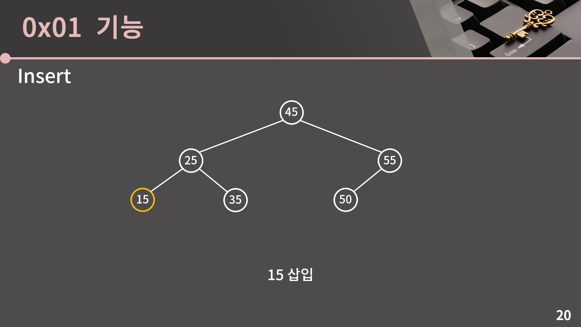 마지막으로 15를 삽입하면 25의 왼쪽으로 가게 됩니다. 삽입은 이 정도로 보고 넘어가겠습니다.