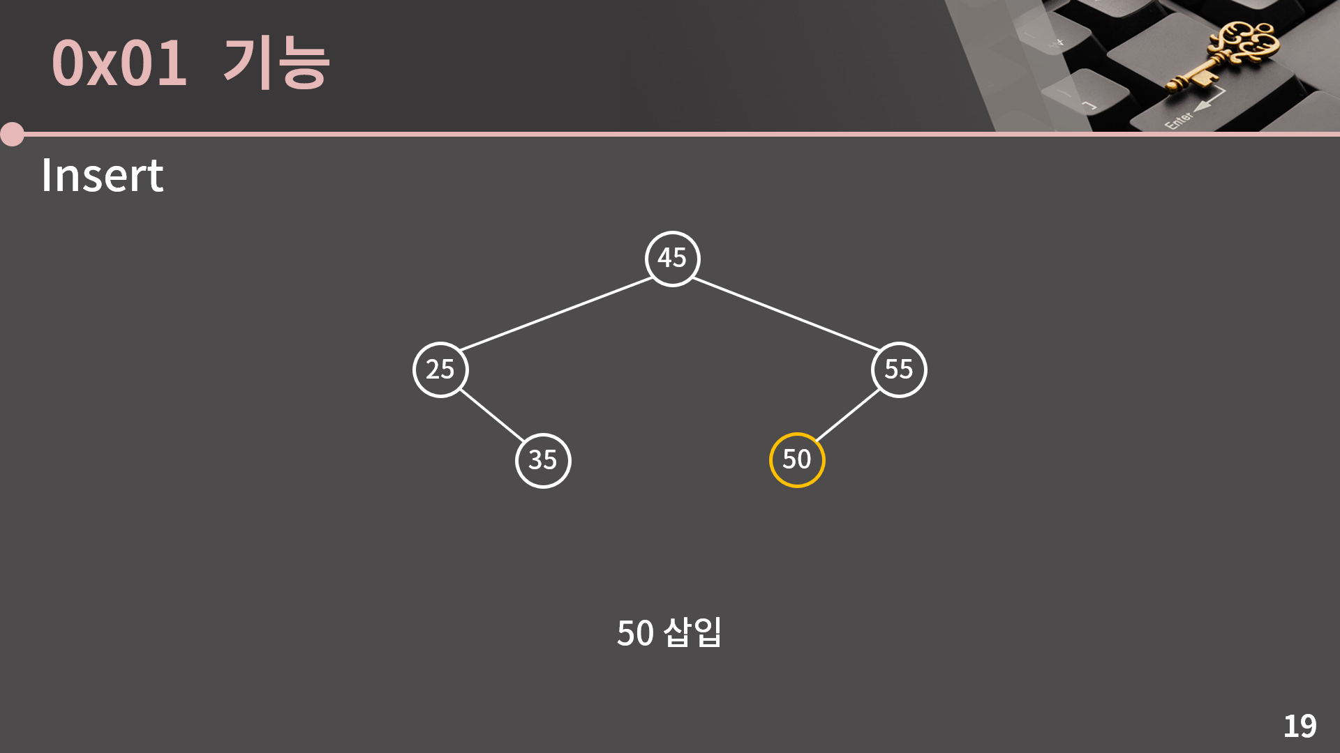 55를 삽입해보면 45의 오른쪽으로 가게 됩니다.