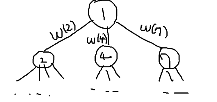 ii) 1이 도착지 혹은 시작지는 아니면서 1을 포함하는 경로 : 1을 기준으로 서로 다른 subtree에 속해있는 두 node간의 경로. 이들의 합은 ((D[2]+1)*W[2])*((D[4]+1)*W[4])+((D[2]+1)*W[2])*((D[7]+1)*W[7])+((D[4]+1)*W[4])*((D[7]+1)*W[7]) 로 계산할 수 있습니다. 편의상 A[i] = (D[i]+1)*W[i] 로 쓴다면 A[2]*A[4]+A[4]*A[7]+A[2]*A[7]과 같습니다. 바로 와닿지 않는다면 간단한 예시에 대해 테스트해보면 쉽게 감이 올 것입니다.