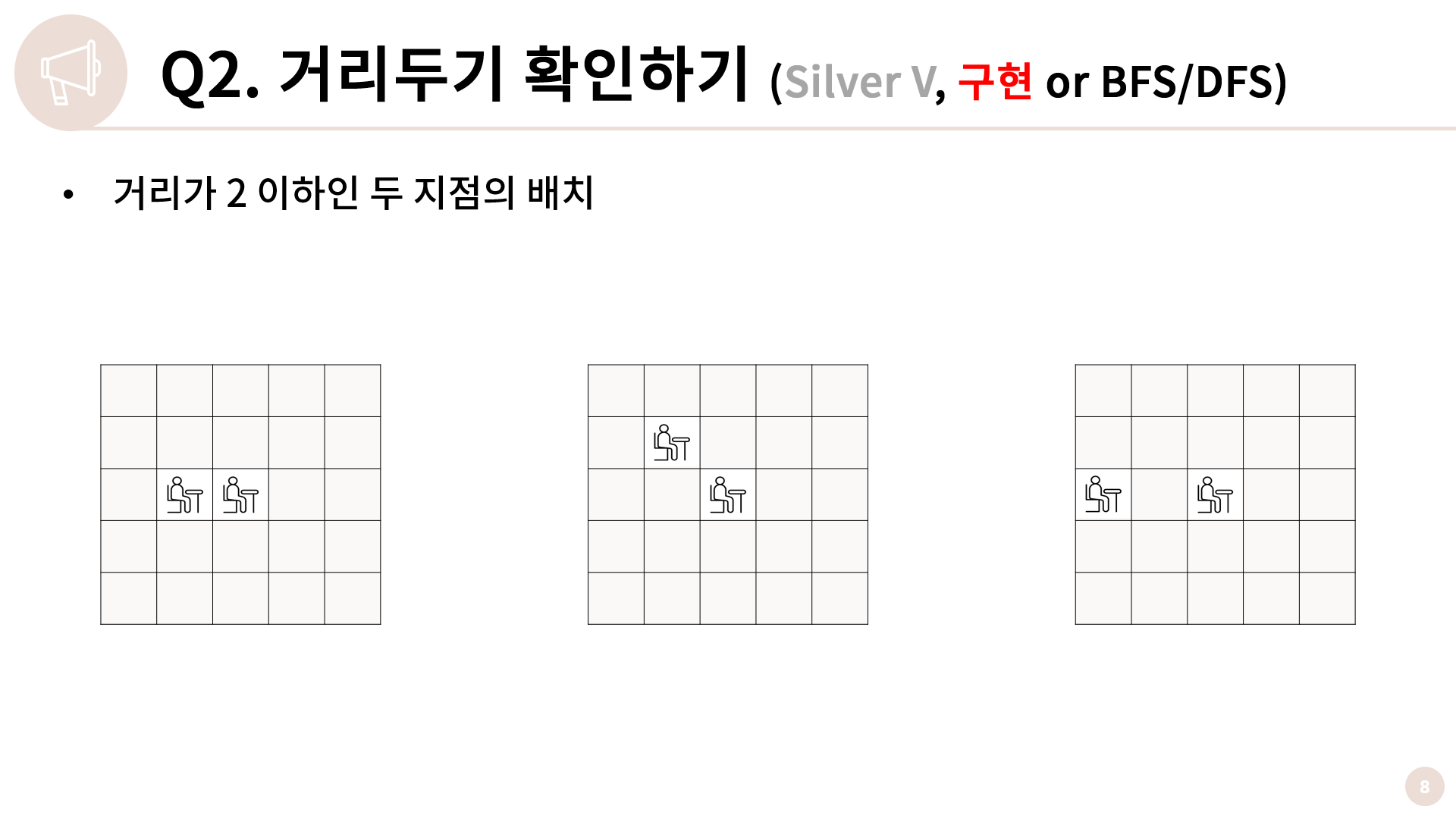 직접 구현을 하지는 않았지만, 각 응시자의 위치를 시작점으로 두고 BFS 혹은 DFS를 돌려 거리가 2 이내인 곳에 다른 응시자가 있는지 확인하는 풀이도 통과 가능합니다.