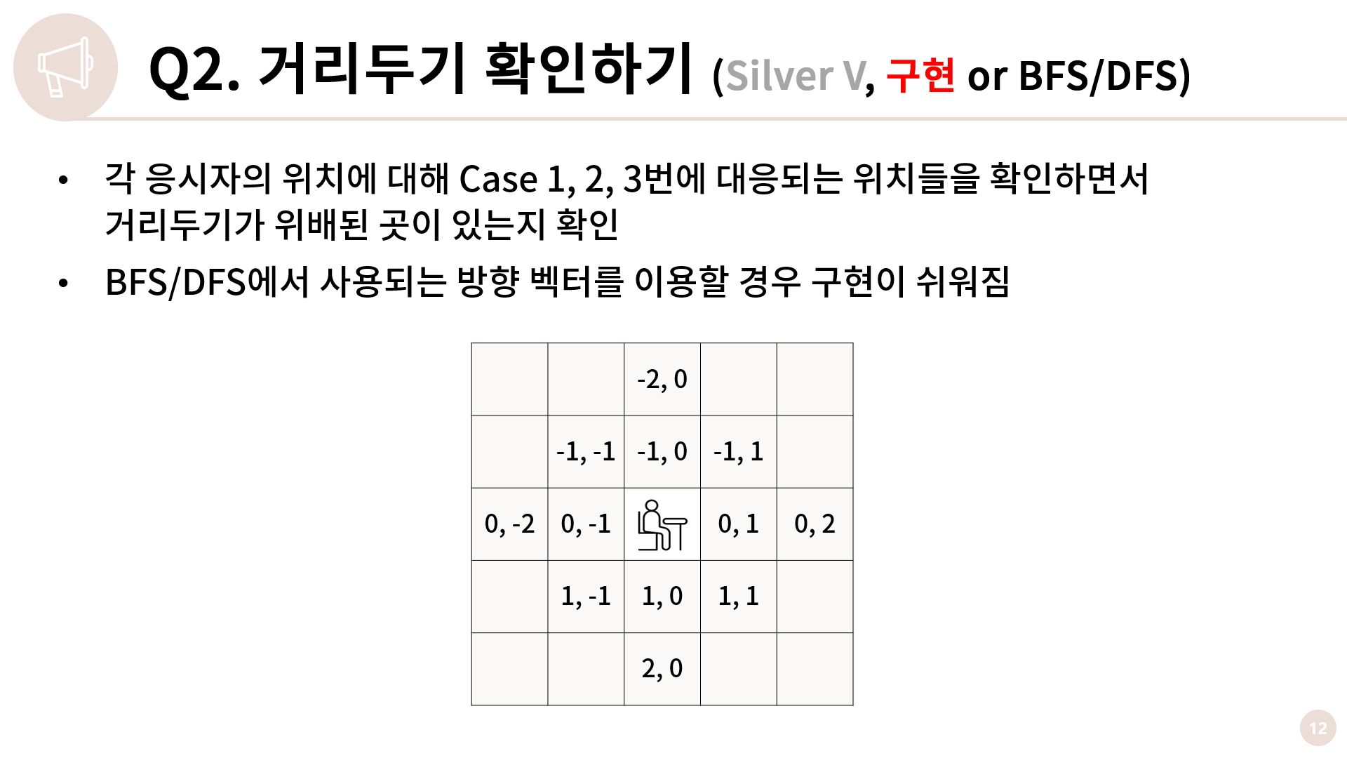 각 응시자의 위치에 대해 Case 1, 2, 3번에 대응되는 위치들을 확인하면서 거리두기가 위배된 곳이 있는지 확인하면 됩니다. 여러 위치들을 하나하나 다뤄도 되지만 BFS/DFS에서 사용되는 방향 벡터를 이용하면 구현이 쉬워집니다. 자세한건 코드를 참고해주세요.