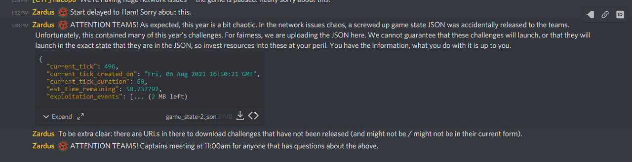그런데 시작하자마자 주최측에서 좀 사고를 쳤습니다. 원래 대회에서는 문제를 순차적으로 공개하는데 실수로 attack & defense의 모든 문제가 보여지도록 했습니다,,,,