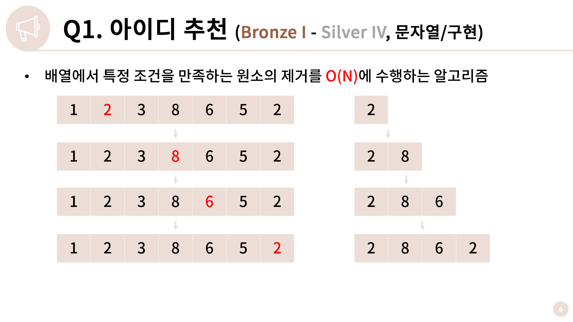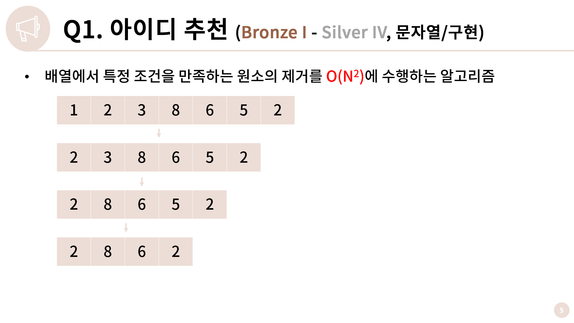 2단계에서는 배열에서 특정 조건을 만족하는 원소를 제거합니다. 이 때 앞에서부터 보면서 원소를 지워나가면 배열에서 원소의 제거는 O(N)이기 때문에 총 O(N2)이 필요합니다.